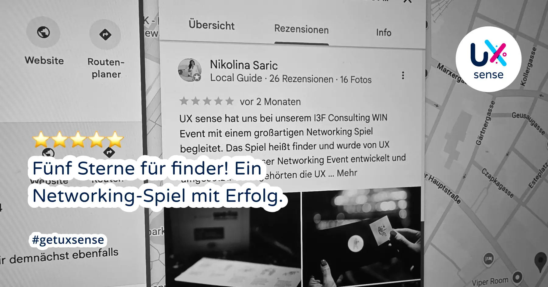 Wenige Tage nach dem I3F Consulting WIN Event erhielt finder – das Networking-Spiel eine Fünf-Sterne-Bewertung auf Google – und damit ein besonders starkes Feedback aus Sicht der Veranstalter selbst. In der Bewertung beschreibt das WIN-Team detailliert, warum das Networking-Spiel von UX sense zu einem der Highlights des Abends wurde.